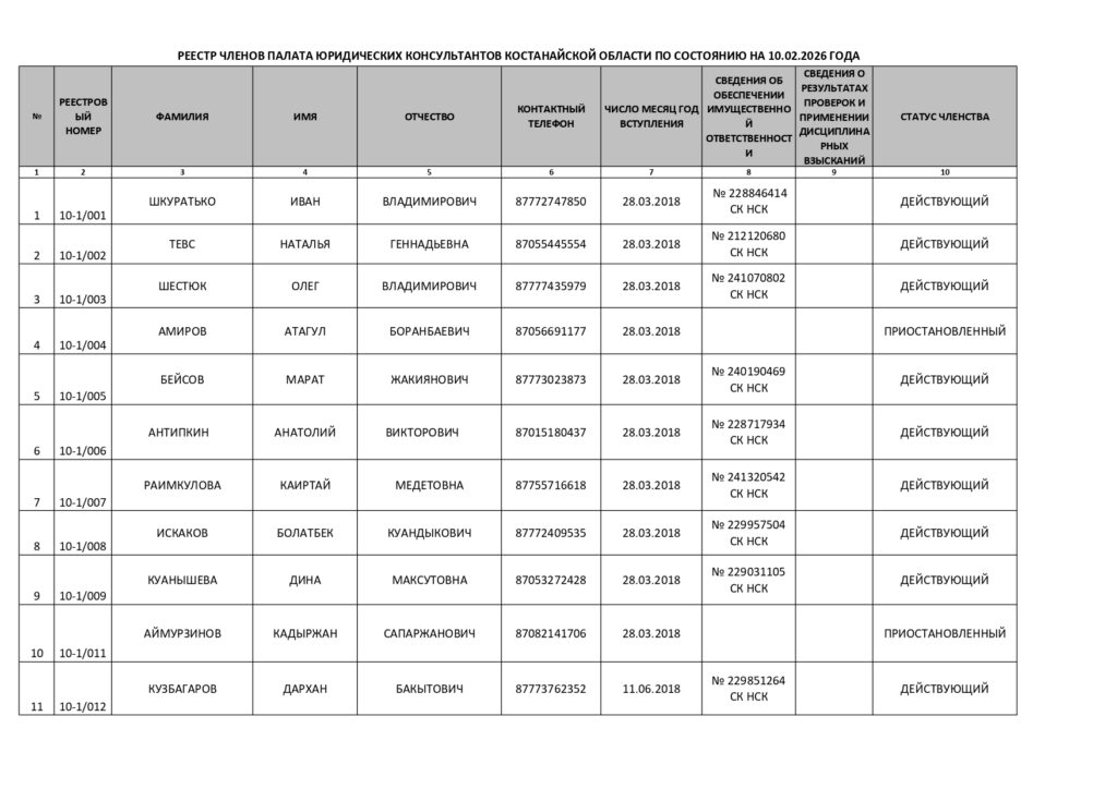 Предоставление постановления правления — коллегиального органа Палаты юридических консультантов Костанайской области от 31 января 2020 года